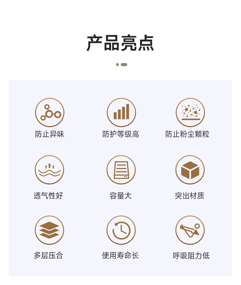 防止異味、防護(hù)等級(jí)高、防止粉塵顆粒、透氣性好、容量大、突出材質(zhì)、多層壓合、使用壽命長(zhǎng)、呼吸阻力低