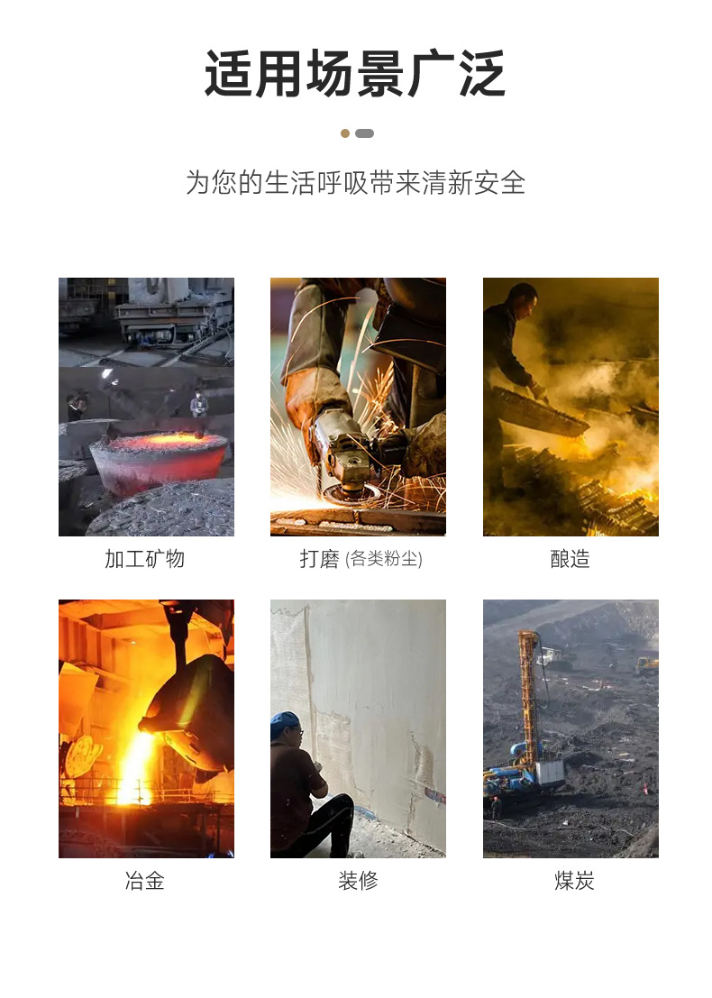可應(yīng)用于釀造,加工礦物、建筑、煤炭、打磨、冶煉、裝修、打磨等作業(yè)時(shí)產(chǎn)生的粉塵防護(hù),可用于防護(hù)各種顆粒物,包括電焊煙、油煙玻璃纖維、碳纖維等顆粒物。
