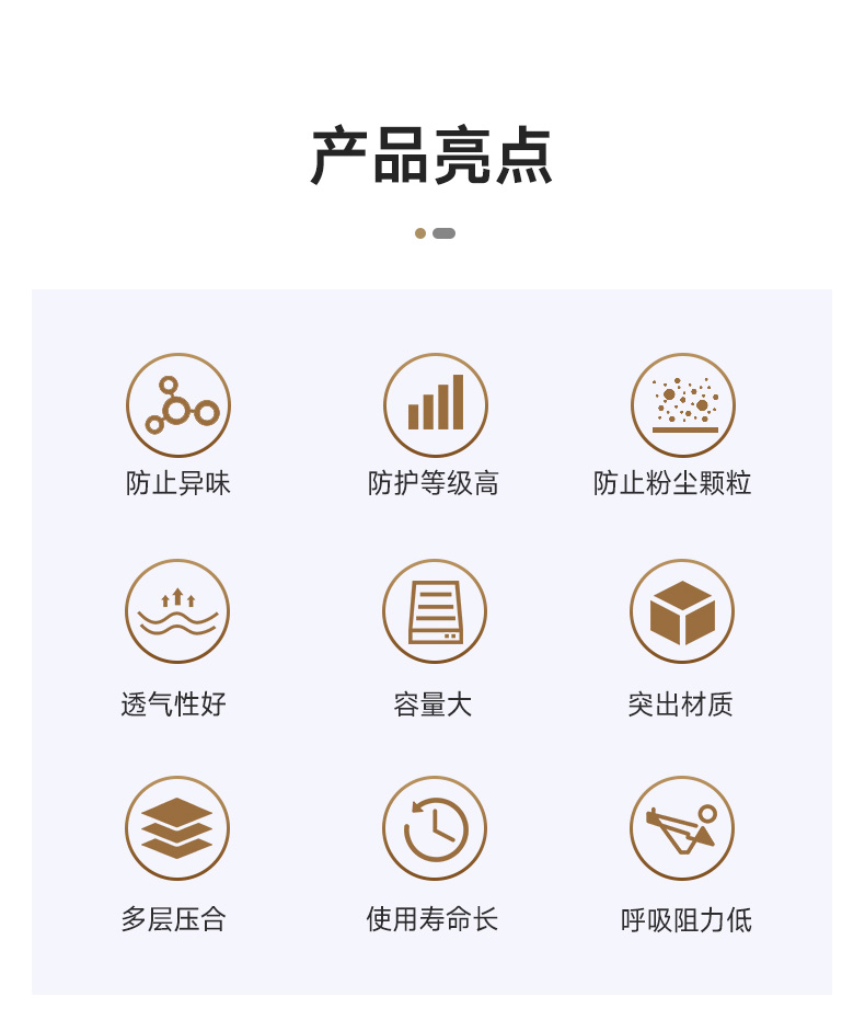 防止異味、防護(hù)等級(jí)高、防止粉塵顆粒、透氣性好、容量大、突出材質(zhì)、多層壓合、使用壽命長、呼吸阻力低