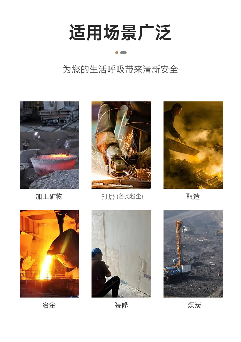 可應(yīng)用于加工礦物、建筑、煤炭、打磨、冶煉、裝修、打磨等作業(yè)時(shí)產(chǎn)生的粉塵防護(hù),可用于防護(hù)各種顆粒物,包括電金屬煙、油煙、玻璃纖維、碳纖維等顆粒物。