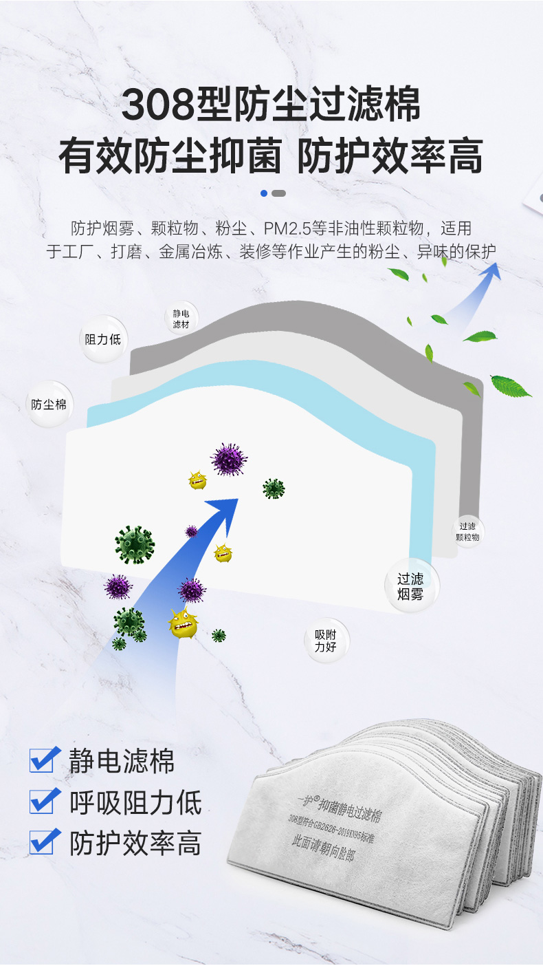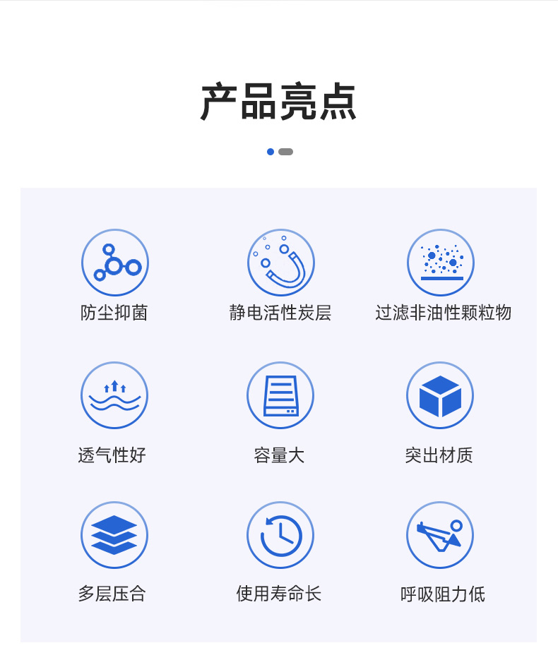 防塵抑菌、靜電活性炭層、過(guò)濾非油性顆粒物、透氣性好、容量大、突出材質(zhì)、多層壓合、使用壽命長(zhǎng)、呼吸阻力低
