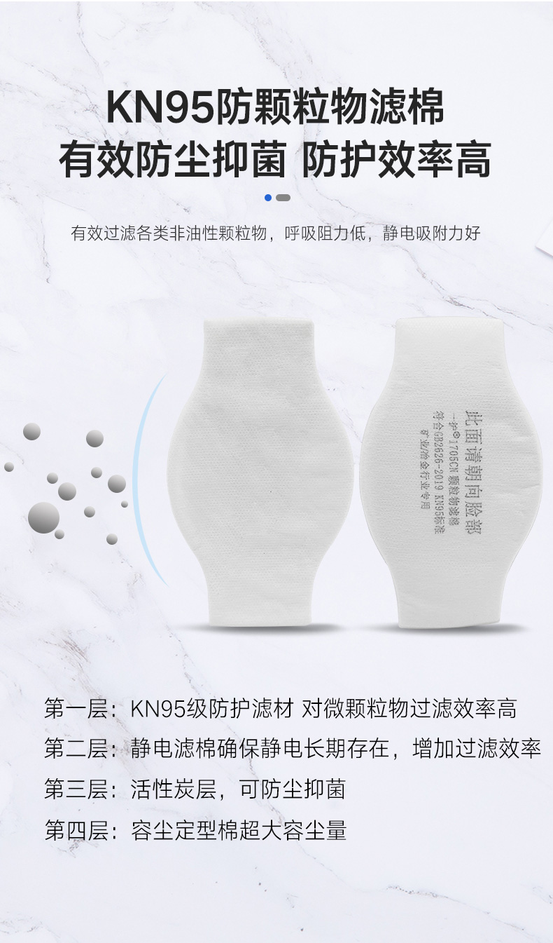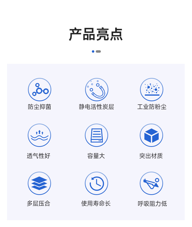 防塵抑菌、靜電活性炭層、過濾非油性顆粒物、透氣性好、容量大、突出材質、多層壓合、使用壽命長、呼吸阻力低